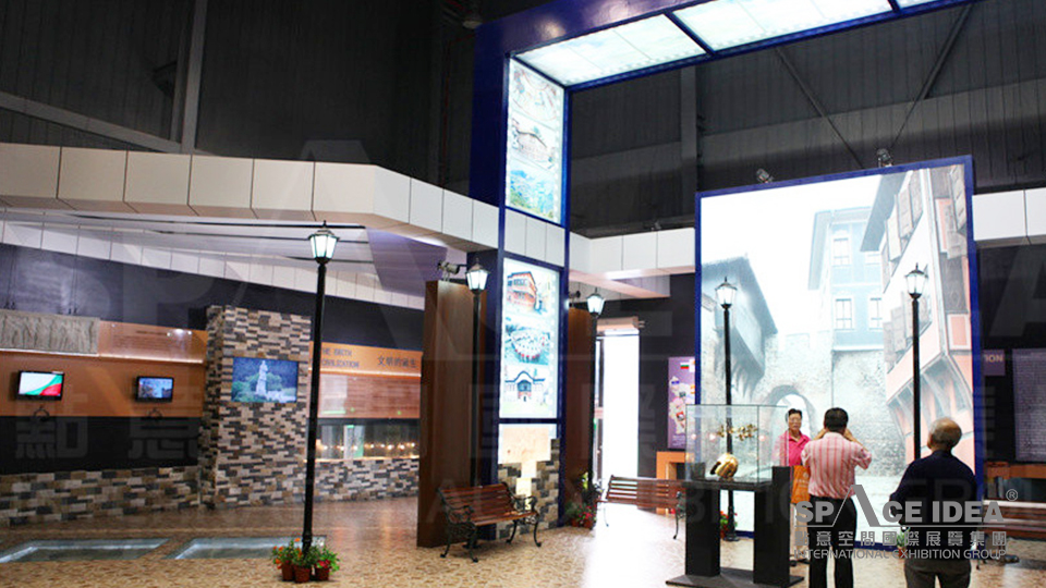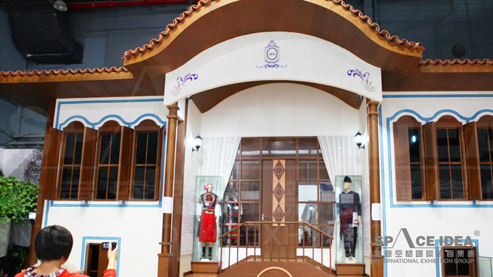 广场展区一角仿照保加利亚一座著名的博物馆,墙上的壁画和木雕天花板精美绝伦,轭、弓形窗、宽大屋檐和封闭阳台具有独特的建筑特点。