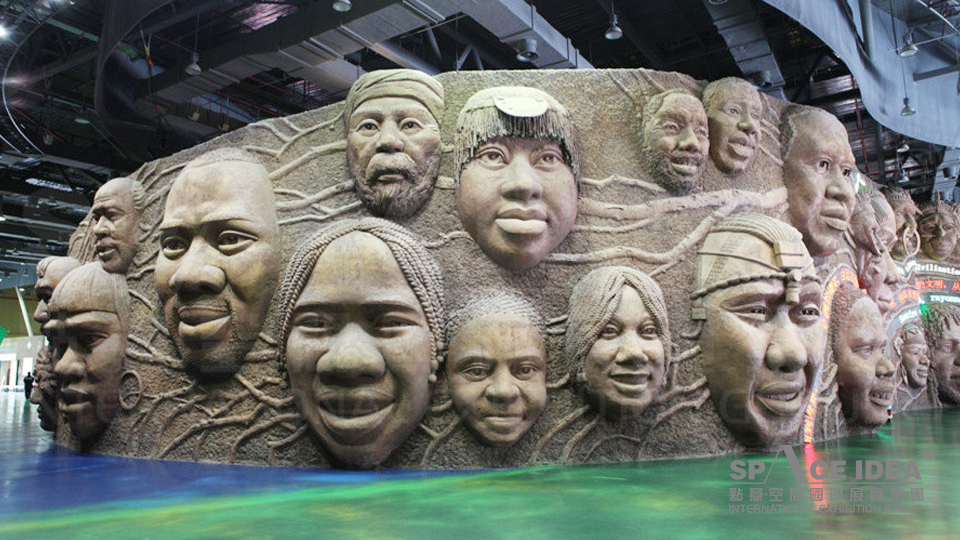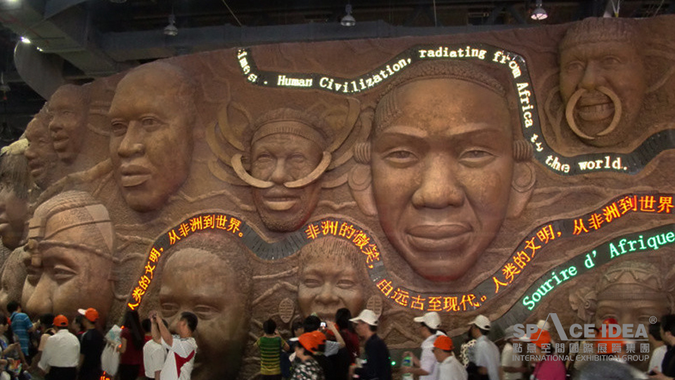 走进非洲联合馆,一面巨大的人脸雕像群“非洲的微笑”映现眼前。她的灵感来自于埃塞俄比亚发现的320万年前古人类遗存的化石。人类共同的母亲“露西,通过多媒体的形式,从远古时代猿人的脸逐步过渡到现代人的微笑,给人以强烈的视觉冲击力,非常动人,感人,增添了浓郁的人文气息。环顾四周,海洋般深邃的蓝、原始森林里广袤的绿和太阳直射下沙漠的灿黄,三色颜料绘成的地板顷刻间带领游客返回古老的人类诞生地非洲。