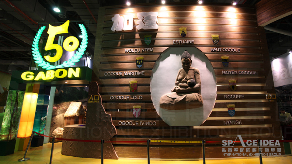 加蓬共和国馆的主题为城市和乡村的互动,展馆入口处非洲特有的红色土墙和木条结构自然醒目,墙面上是加蓬国内著名雕塑的浮雕和各省的标志。馆内分“乡村文明”、“城市文明”和“自然森林资源”三大展区,展现城市与乡村完全融合的概念:我们自乡村来,到城市去,在城市中发现自我、实现自我,最后再回到乡村。“乡村文明”展区通过直观的工艺品、建筑模型展现加蓬的田园生活和乡村文明,特别是加蓬传统居住形式的演变过程。“城市文明”展区通过投影、多媒体视频展现现代城市风貌。“自然森林资源”展区展示了加蓬自然风光、动植物资源、旅游资源。