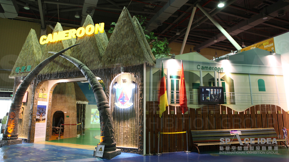喀麦隆展馆的主题为城市社区的重塑,以大树为核心设计,敞开式空间以绿、黄、蓝为主色,展现喀麦隆自然、乐观、富有动感的民族风情。展区模拟喀麦隆高原、海滩、雨林等多样的自然环境,同时展示喀麦隆城市民居建筑发展的新貌。城市社区的重枝繁叶茂的大树覆盖整个展馆,反映了喀麦隆对森林的重视和有效保护。馆内的模拟足球场以音响灯光营造动感氛围,使人充分感受喀麦隆城市的惬意生活和运动激情,还有喀麦隆人民对足球的热爱。