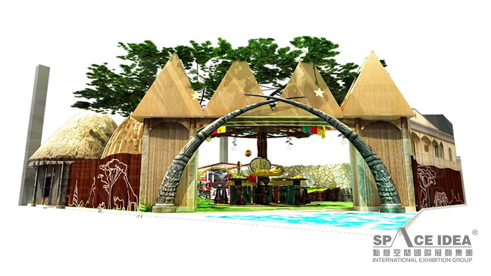 “外”——咖啡色木栅栏上用线条勾勒出热带动物和房屋的图像,与非洲联合馆外观有异曲同工之妙。天