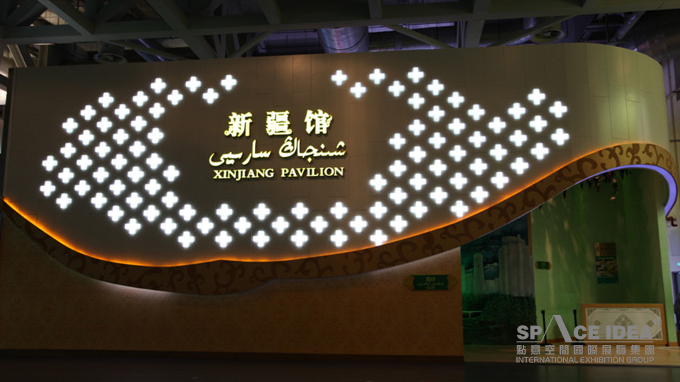 新疆馆的主题为“新疆是个好地方”。新疆馆外观选取新疆独有的造型元素,用单一的符号做矩阵式的排列,巨大的体量和形式符号,简约主义的风格形成第一视觉冲击力,以虚实结合的表现手法让观众第一眼就认出——这就是新疆馆。底部空间半通透的设计寓意为将要掀起的盖头,透视出内空间华美的铺陈,“我们新疆好地方”热情的歌声隐约传来,让观众立即能从视觉、听觉、色彩上识别新疆馆,直观、简约、大气。
