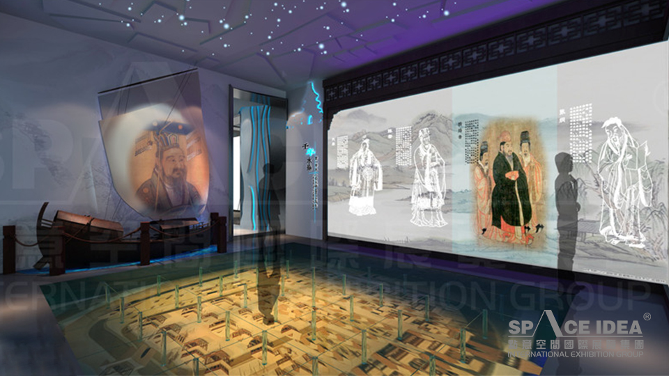点意空间利用知识性与互动性相结合的传达手段,打造出了一组U型屏投影装置,在营造身临其境的环境氛围的同时,为参观者的视觉与听觉带来双重震撼。当人们进入空间时,仿佛置身于船头而沉浸在扬州四季变换的山水间,实现真正意义上以“人”为核心的体验效果。