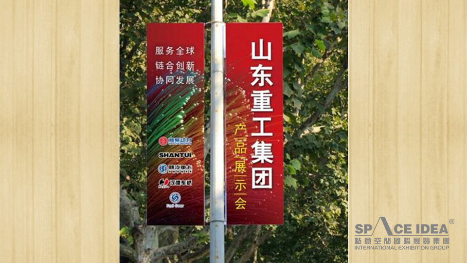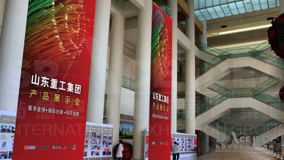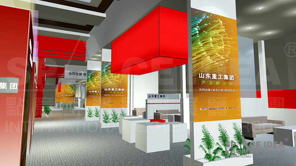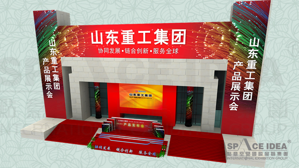会场气氛渲染是除了主展示区外的区域。通过对会场内外的展示布局,起到宣传、指示作用。通过层层引导,持续不断的视觉宣传效果,把本次年会的气氛烘托起来,展示出山东重工集团的实力,为本次产品展示会做好宣传作用。