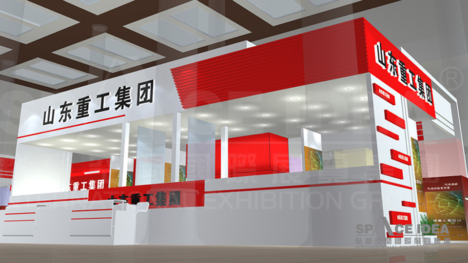 2. 零部件展示区。处于整个展区的中心位置,用发光的灯箱字,把山东重工的形象拔高,前方留出通透的空间,在第一视角占领视线,并形成整个展场的焦点。