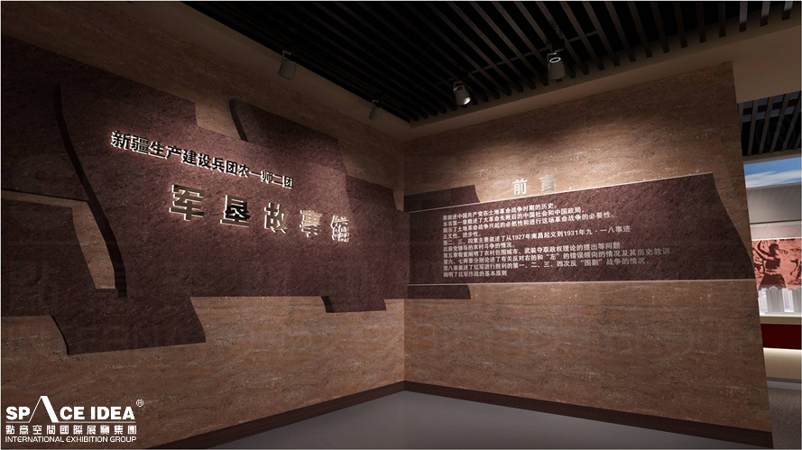 展厅中央蓝天白云设计元素源于“开天”,左面展区设计元素源“辟地”,寓意老一辈二团军民开垦家园、艰苦奋斗的开疆精神;右侧展墙以中国古朴红色...