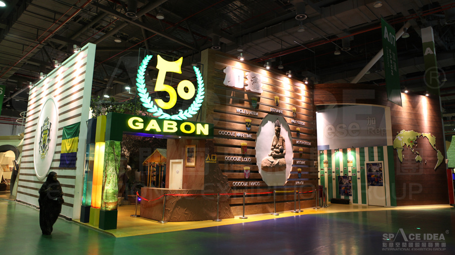 加蓬共和国馆的主题为城市和乡村的互动,展馆入口处非洲特有的红色土墙和木条结构自然醒目,墙面上是加蓬国内著名雕塑的浮雕和各省的标志。馆内分...