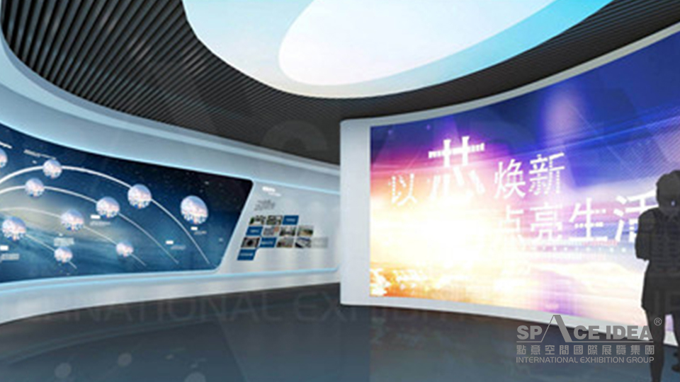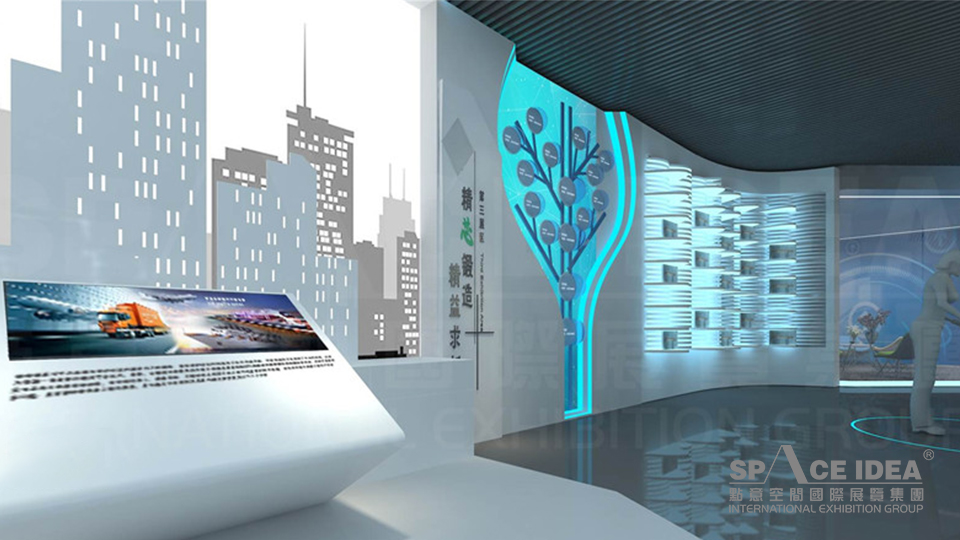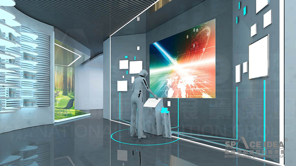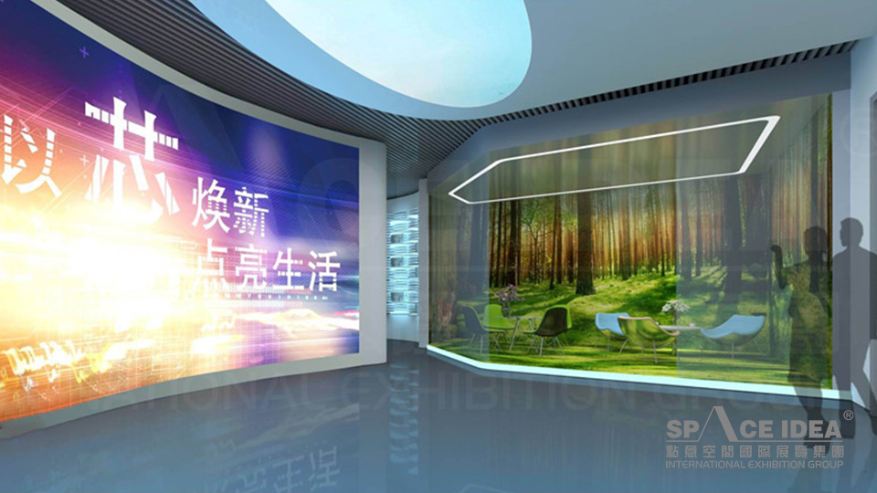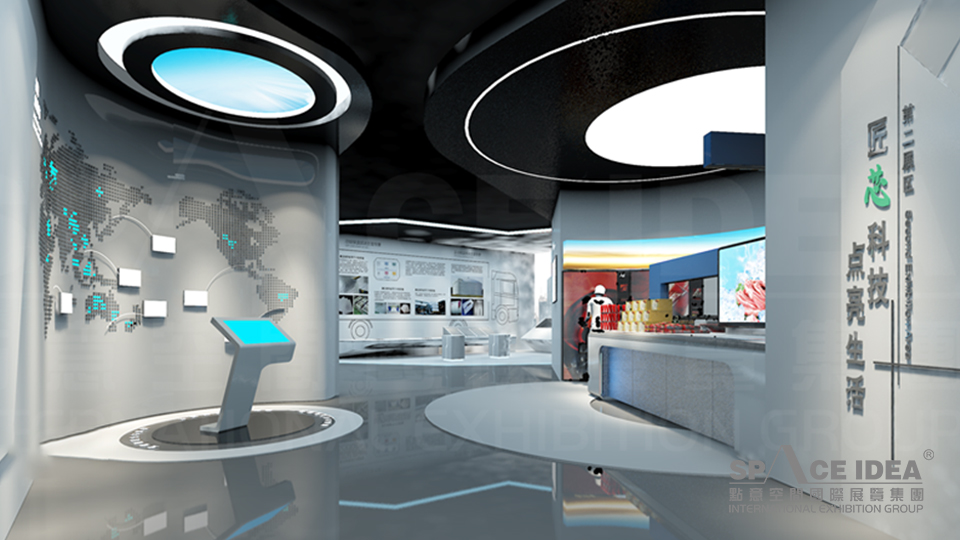 设计上以未来白为背景色,配合科技蓝和生命绿铺张整个展区,营造展示和谐舒适的展览氛围,色彩体系干净、明亮,保证了色彩体系的完整性,又使整个展厅色彩饱满,丰富活跃,畅快、大方,韵律感强。