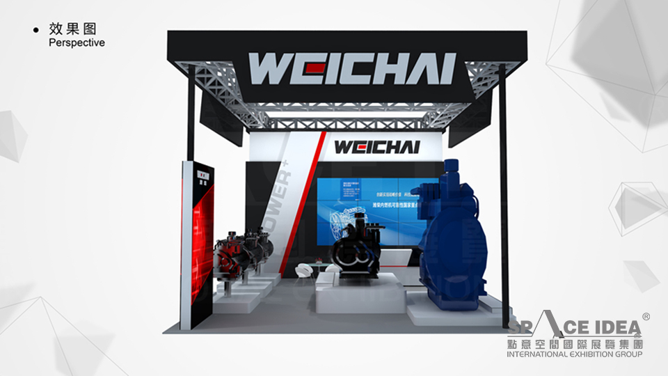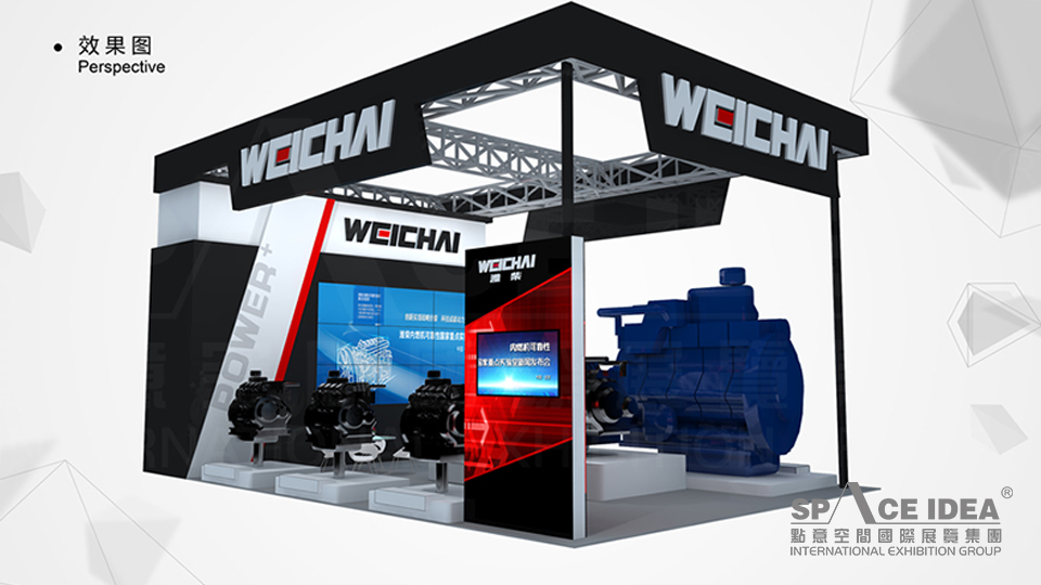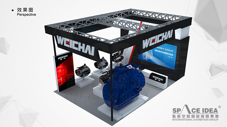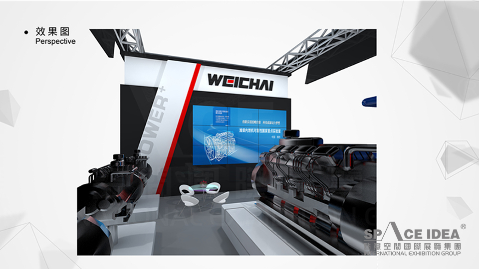 以潍柴LOGO中的黑色为主基调来进行环境的渲染,通过产品展示区进行展示,呈现出潍柴神秘又有科技含量的品牌形象,给人一种厚重的视觉冲击力。大型LED显示器,用视频的形式展现潍柴内燃机的发展历史及技术创新;设计过程中,采用三面开放的空间构造模式,内部功能合理明确,上面为镂空设计,整体感觉大气高端。