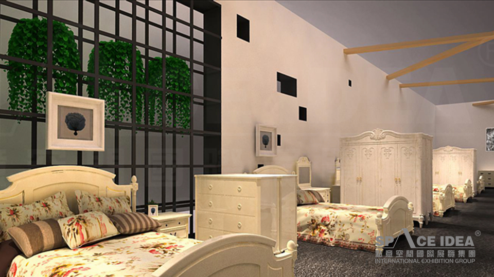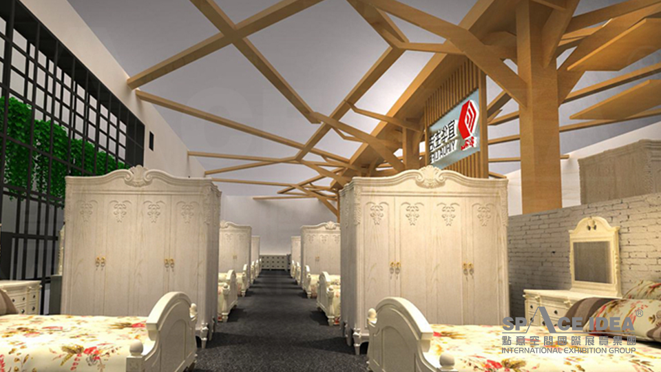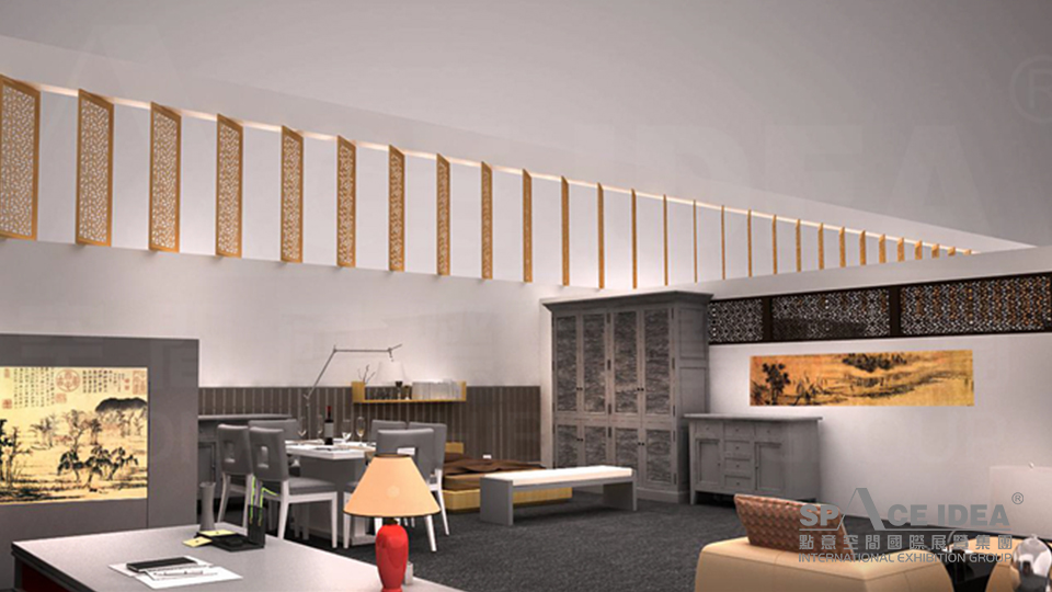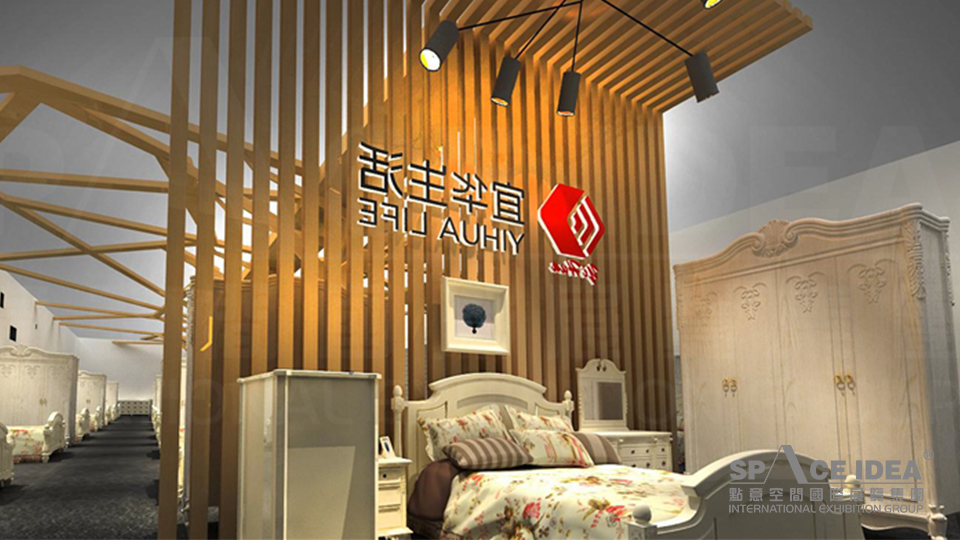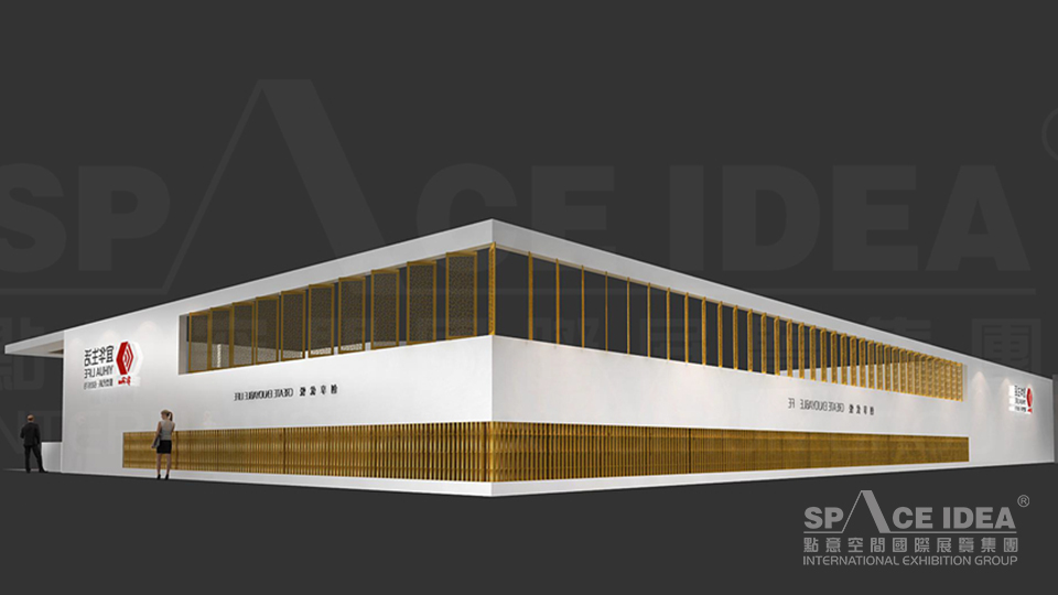本案以白色及金黄为主基调,宜华生活LOGO图形传承辉煌历史,以明亮的红色传达宜华生活从传统制造业到互联网住居生活服务业的跨越,诠释一种拥抱生活,激情活力的姿态。倒立的LOGO可以激发观众的好奇心,又打破常规,不落窠臼。外墙提取中式传统窗棱加以装饰,给人一种古典雅致的感觉。展台内墙壁上悬挂装饰画及绿植,与宜华家居的软体家具、一体化橱柜衣柜、智能家具及家具用品一起营造出一种宜家宜业的氛围。