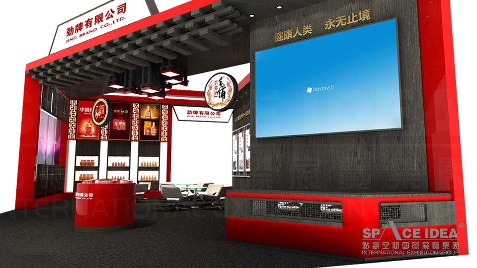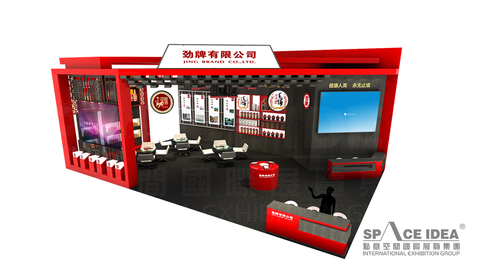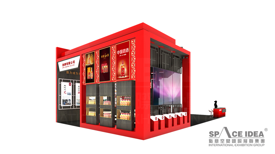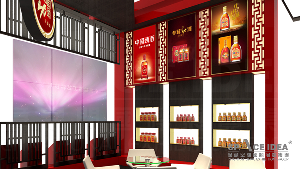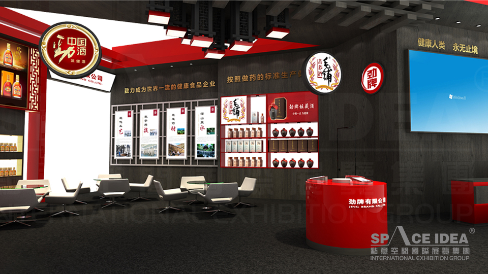 本案以中国红为主色调,配以黑色的内墙与地板,极富视觉冲击力。采用中式橱窗来摆放劲牌各种酒产品,中间摆放了三张桌椅,观众可以一边休息,一边品尝劲牌名酒。入口处的大型LED屏播放劲洒的制作工艺,传播劲牌酒业的企业文化及理念追求,体现了劲牌酒业对健康生活的不懈追求。