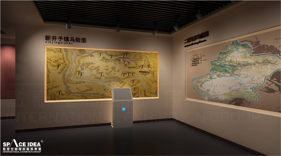 Due to limitations of the exhibition area, we wrapped four pillars into a cabinet wall in the design. Through the display of portrait wall and pictures of labor scenes in Xinjiang, visitors can get to know more about the reclamation process of the 2nd group of Henan people in Xinjiang. It is convenient and clear for Henan people to reclaim the history of Xinjiang with plasma. At the same time, three special typical characters are shown in the cabinet room, which is typical and representative.