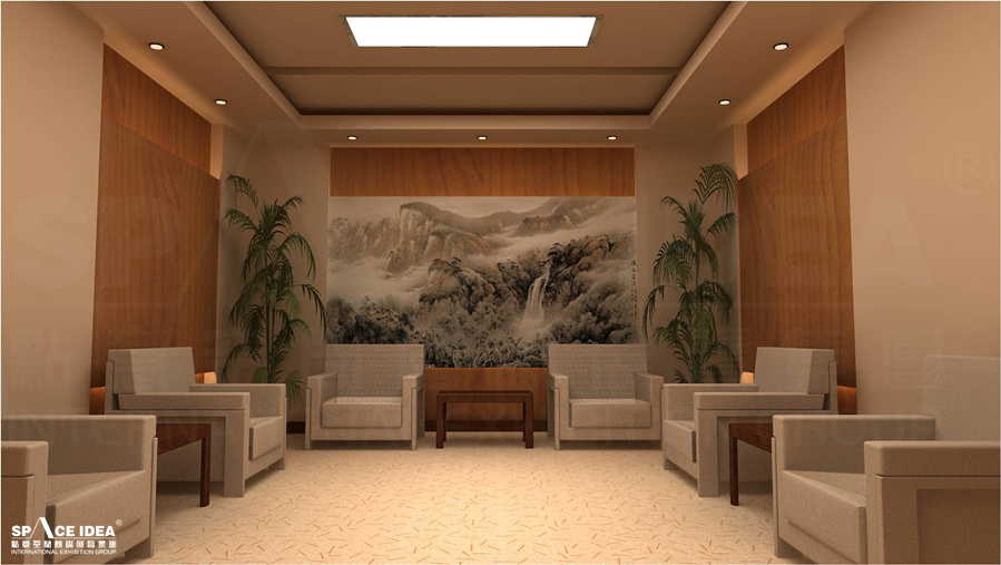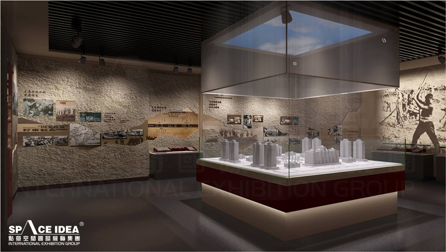 The design elements of blue sky and white clouds in the center of the exhibition hall originate from "creation of the sky", while the design elements in the left exhibition area originate from "creation of the land", which implies the pioneering spirit of older generation of the 2nd army and people to reclaim their homes and struggle hard. The right side of the exhibition wall takes Chinese ancient red color as the main tone, meaning that the two groups of military and civilian will create a better future for Jingzi Town (central sand table) under the guidance and care of the CPC central committee.