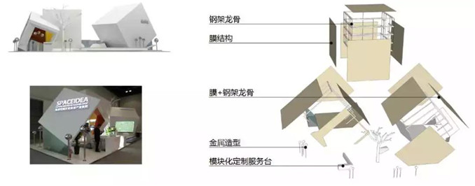是否绿色环保,不仅与材料应用(木质、型材、金属等)有关,还涉及艺术设计和工艺结构应用设计的问题。在商业展示空间设计中,可以结合传统工艺、环保材料,以富于创意的设计,形成一整套标准化建造系统。针对不同的场地可以将非标模块便捷、迅速地拼接组合,在保障设计效果的同时,有效控制成本,并实现资源循环利用。