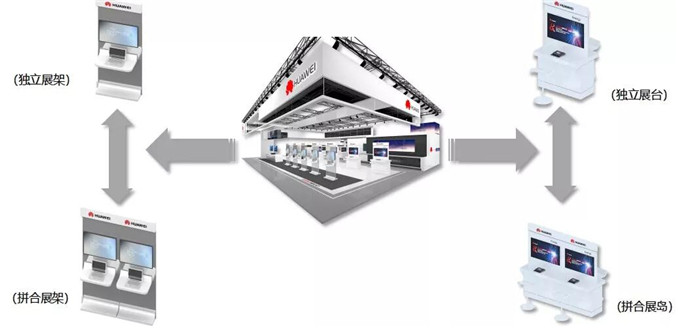 以點意空間为华为EBG中国区2018标准展厅展台设计的模板为例。模块化的设计理念、标准的组建结构:单岛、双岛、展桌或者展柜,像乐高积木一样,可根据不同展会、不同行业重新组建,自由拼接,重复使用,适配于华为九大行业或大或小的展台。