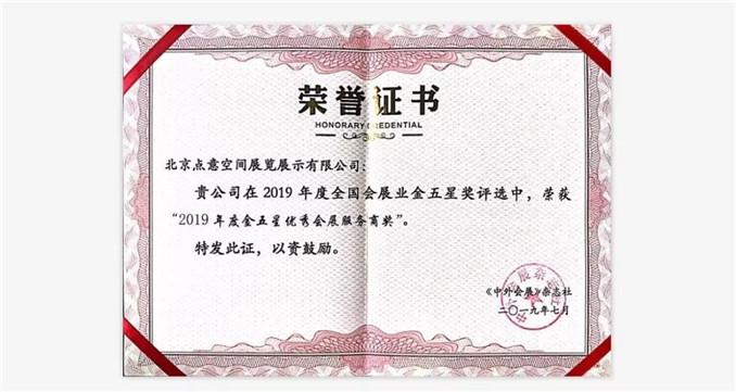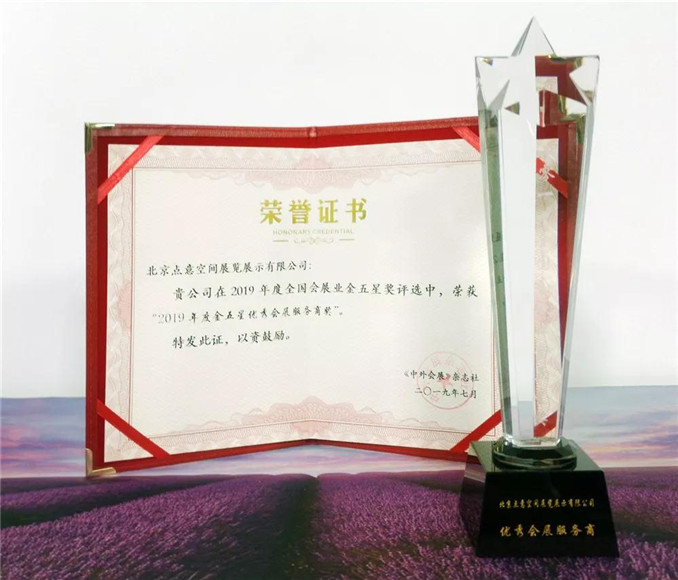 北京點意空間展览展示有限公司再次获得“2019年度金五星优秀会展服务商奖”荣誉称号,这是业界对點意空間近年来取得的成绩的高度认可和极大鼓励。