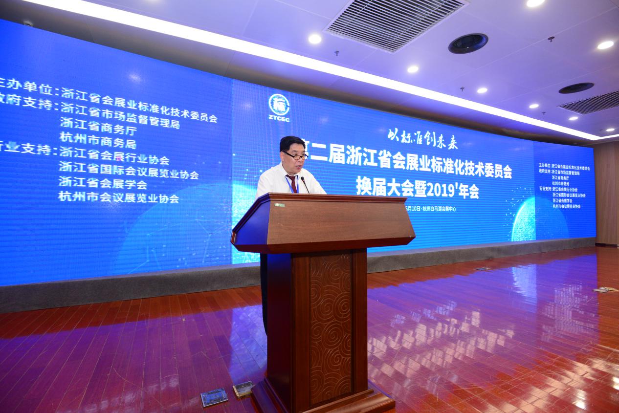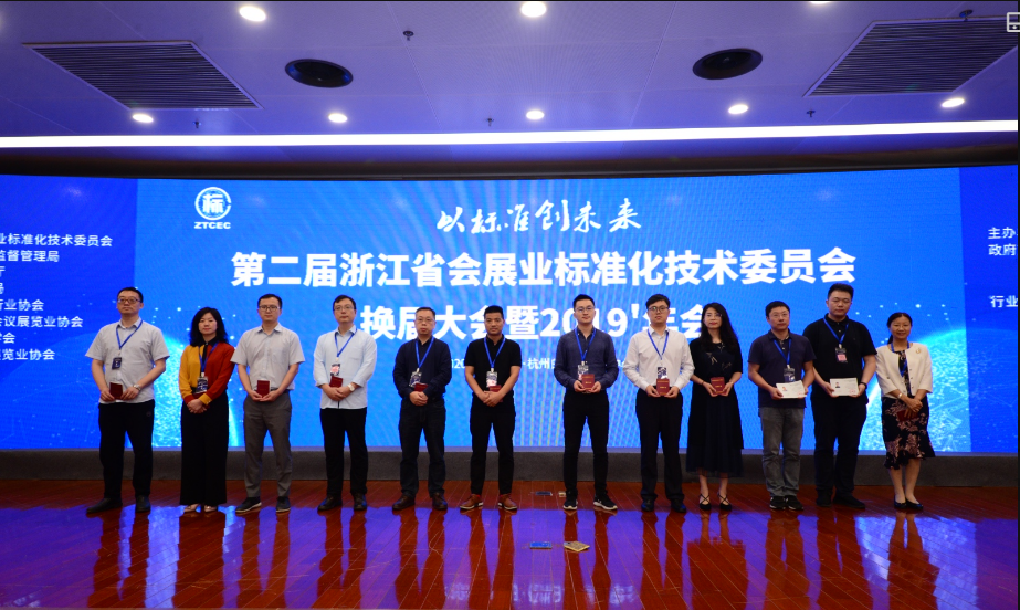 6月10日上午,第二届浙江省会展业标准化技术委员会换届大会暨2019年会在杭州白马湖国际会展中心隆重举行。浙江省市场监督管理局标准化处调研员郑勤、浙江省商务厅服务贸易处处长庄谨、杭州市人大常委会原副秘书长、办公厅主任冯俊、首任浙江省会展业标准化技术委员会主任委员施永胜、浙江省会展行业协会原会长王昌友、第二届浙江省会展业标准化技术委员会主任委员洪致平、浙江省会展行业协会会长刘志刚、杭州市会议展览业协会常务副会长兼秘书长沈杨根、浙江育英职业技术学院创意设计分院院长宋连凯等来自省市级主管部门、会展行业、企业、会展教育界的领导和嘉宾莅临现场。